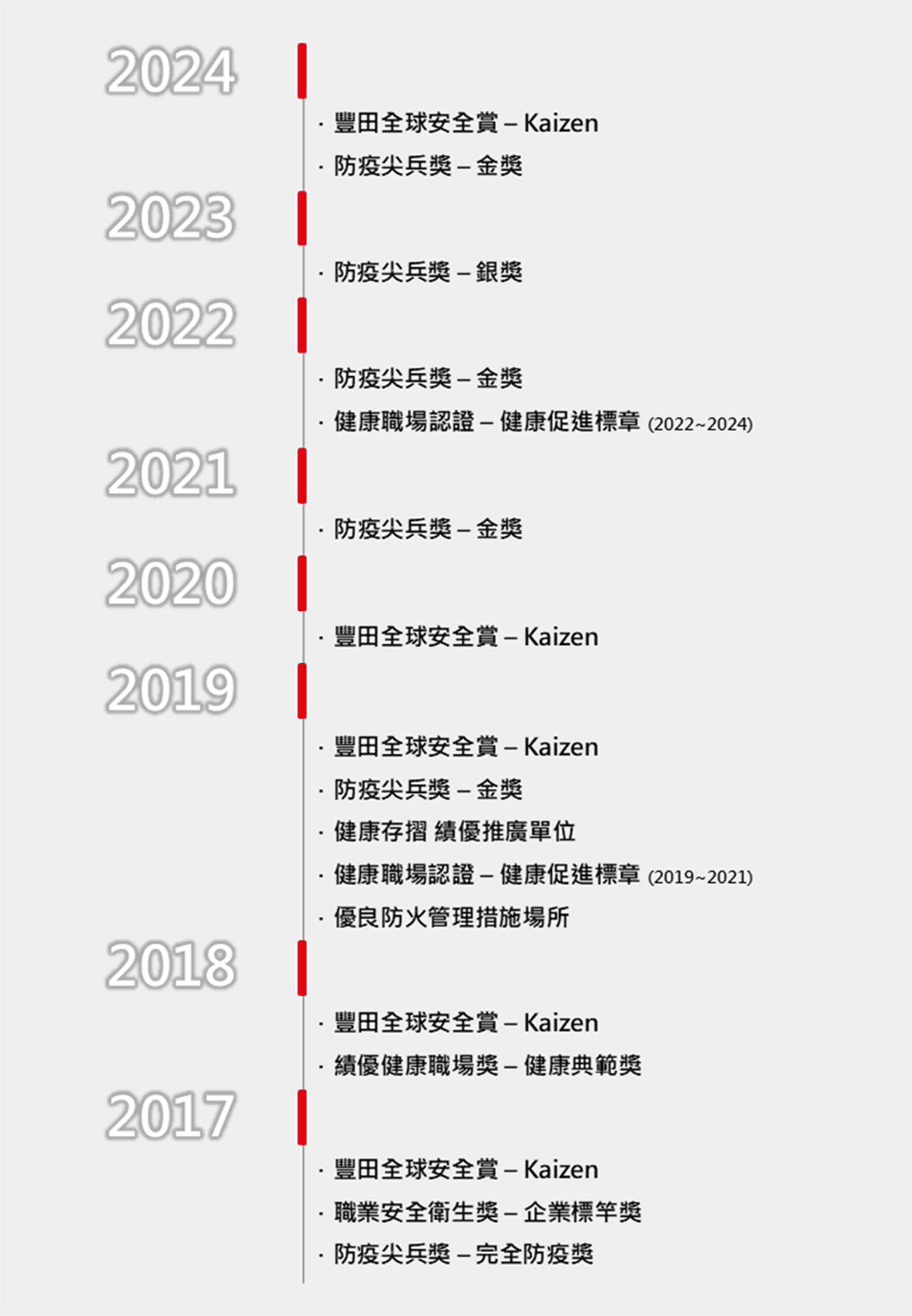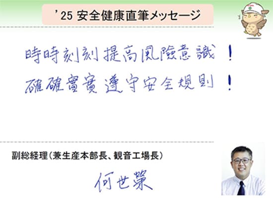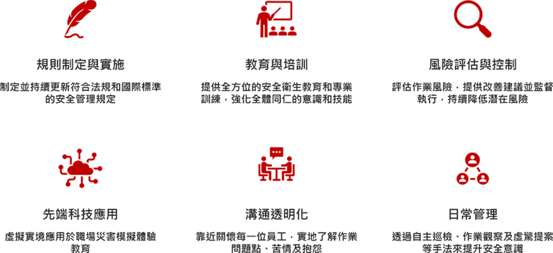 - 預防危害:持續推動風險管理,藉由職場自主管理的實踐,達成零災害目標。