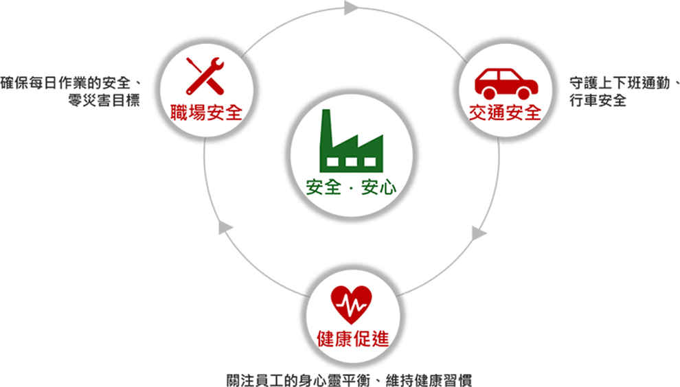 從工作場所的風險管理,到日常通勤的交通安全,以及身心健康的持續照護,我們致力於打造㇐個讓每位同仁都能安心工作、健康生活的職場環境。