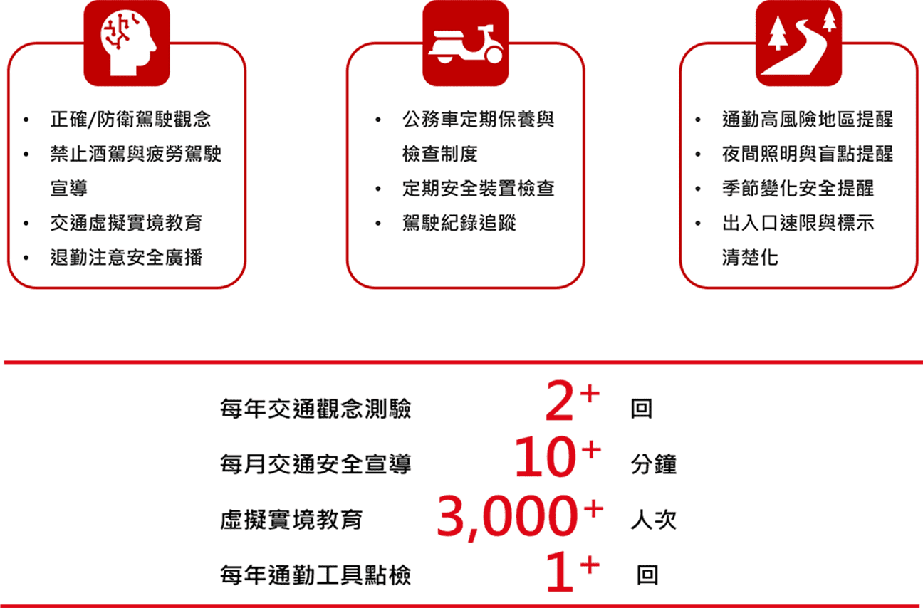 以「人員」、「設備」、「環境」三位㇐體全方位的守護,從移動開始實踐安全。透過制度與關懷,我們讓交通安全不只是規定,而是企業照顧同仁的日常行動。