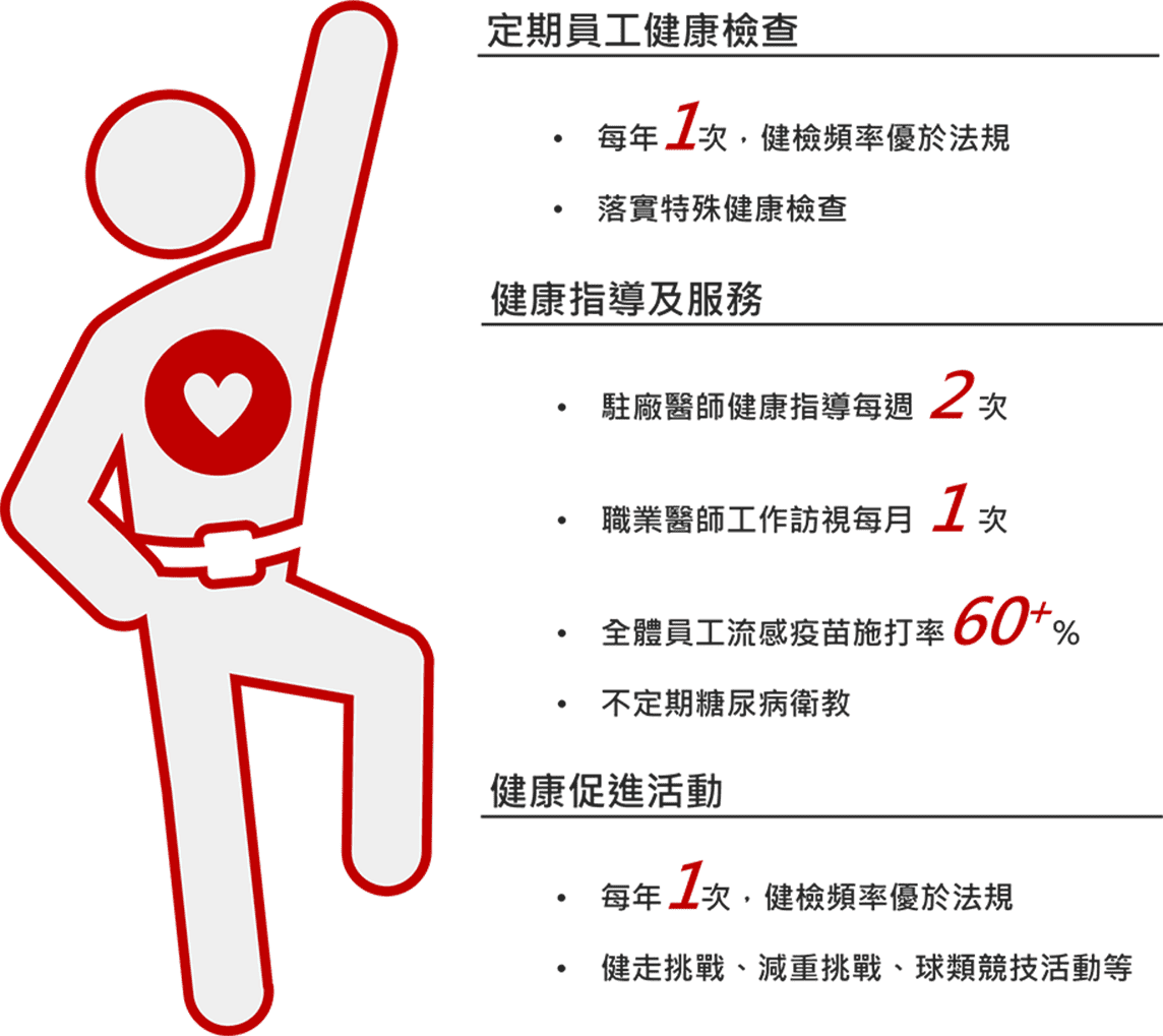 - 健康促進:致力於員工健康保護與關懷,營造身心健康、樂活的工作職場。